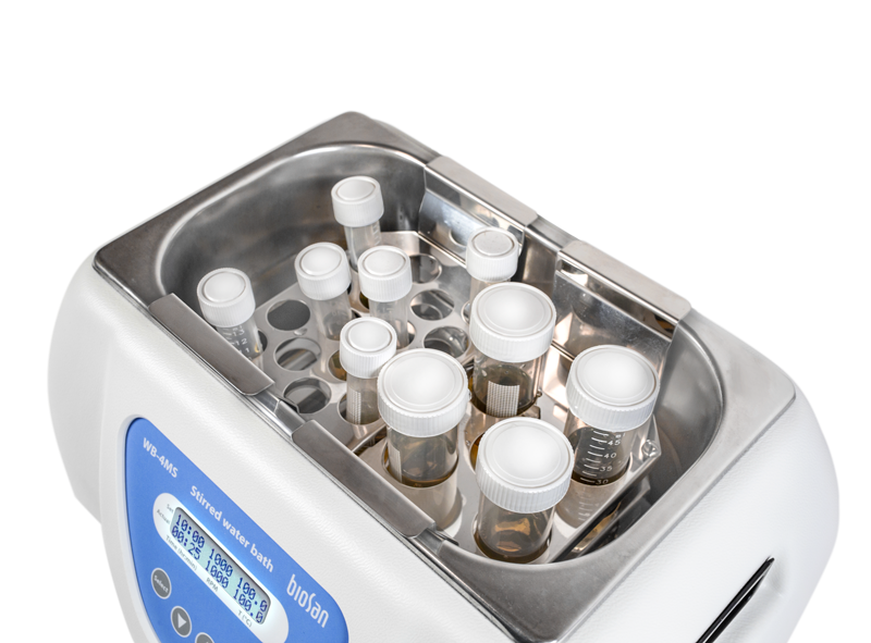 Een voorbeeld uit ons assortiment is de Biosan WB‑4MS, met een inhoud van 4 liter en temperatuurbereik tot +100 °C. Dankzij zijn ingebouwde magnetische roerder (250–1000 rpm) biedt dit bad verhoogde temperatuurstabilisatie (±0,1 °C) en uniforme warmteverdeling. Hij is uitgevoerd met deksel, roestvrijstalen interior en ruimte voor verschillende tube racks (o.a. voor 5 × ø30 mm, 16 × ø16–19 mm, 30 × ø10–13 mm of 44 × 2/1,5 ml tubes). Dit maakt de WB‑4MS uitermate geschikt voor nauwkeurige temperatuurgerelateerde procedures in microbiologie, biochemie en diagnostisch onderzoek.
